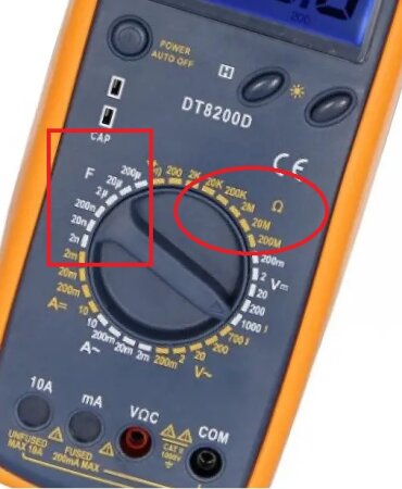 - 1. Встановіть положення перемикача мультиметра у положення вимірювання ємності.