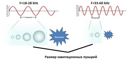 У процесі зміни частоти ультразвуку змінюються розміри кавітаційних бульбашок і як наслідок – потужність ударних хвиль, що утворюються при їх схлопуванні. Тому для кожного завдання є своя частота роботи ультразвуку.